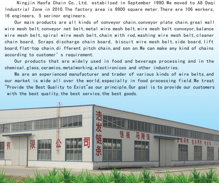 寧津縣浩發(fā)鏈條產(chǎn)品有各種不銹鋼網(wǎng)帶、各種輸送設(shè)備、網(wǎng)帶、鏈板、鏈條、輸送鏈板、馬蹄鏈(長(zhǎng)城網(wǎng)帶)、輸送網(wǎng)帶、金屬網(wǎng)鏈、網(wǎng)帶輸送機(jī)、鏈板輸送機(jī)、乙型網(wǎng)帶、冷凍機(jī)螺旋網(wǎng)帶、橫桿鏈條、洗碗機(jī)網(wǎng)帶、清洗機(jī)鏈板、排屑機(jī)鏈板、餅干機(jī)網(wǎng)帶、擋板及提升式鏈板,平板鏈、大節(jié)距鏈條、大滾子鏈條等設(shè)備。我們浩發(fā)除了制作不銹鋼網(wǎng)帶、長(zhǎng)城網(wǎng)帶等網(wǎng)帶產(chǎn)品和鏈板之外,我們同時(shí)精于制造各種非標(biāo)鏈條、特種鏈條,非標(biāo)輸送帶及鏈輪,亦可根據(jù)客戶需要,設(shè)計(jì)、制造各種生產(chǎn)流水線等。 寧津縣浩發(fā)鏈條有限公司始建于1990年9月,2010年遷址山東省寧津縣大祁工業(yè)園A8,總占地面積9900平方米,現(xiàn)有員工106名,其中技術(shù)人員16名,高工5名。是一家以生產(chǎn)鏈條,鏈板,輸送機(jī)為主的中型企業(yè),本公司集模具開發(fā)、制作、生產(chǎn)、銷售等一條龍型生產(chǎn)企業(yè)。 我公司(浩發(fā)鏈條)技術(shù)力量雄厚,新產(chǎn)品開發(fā)周期短,檢測(cè)手段齊全。產(chǎn)品銷往各地。 承諾:做同行業(yè)中具有經(jīng)濟(jì)競(jìng)爭(zhēng)力的產(chǎn)品。優(yōu)良的產(chǎn)品質(zhì)量、良好的服務(wù)、及時(shí)快捷的交貨速度,滿足您對(duì)產(chǎn)品的需求。 我們期待著客戶的咨詢、考察、洽談業(yè)務(wù),我們將熱忱為您提供服務(wù)。 歡迎您選用“浩發(fā)”產(chǎn)品。